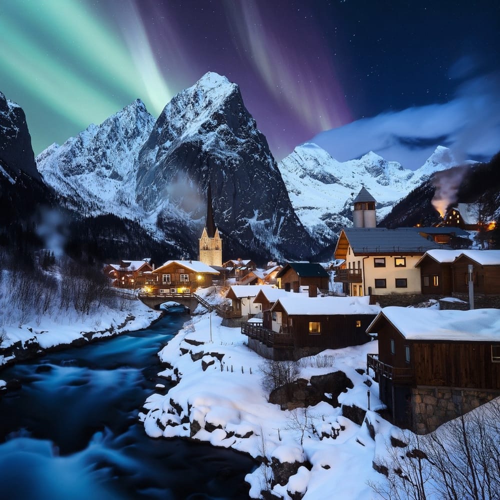 Prompt 4: A snowy mountain village with cozy cabins and a northern lights display, high detail and photorealistic dslr, 50mm f/1.2*