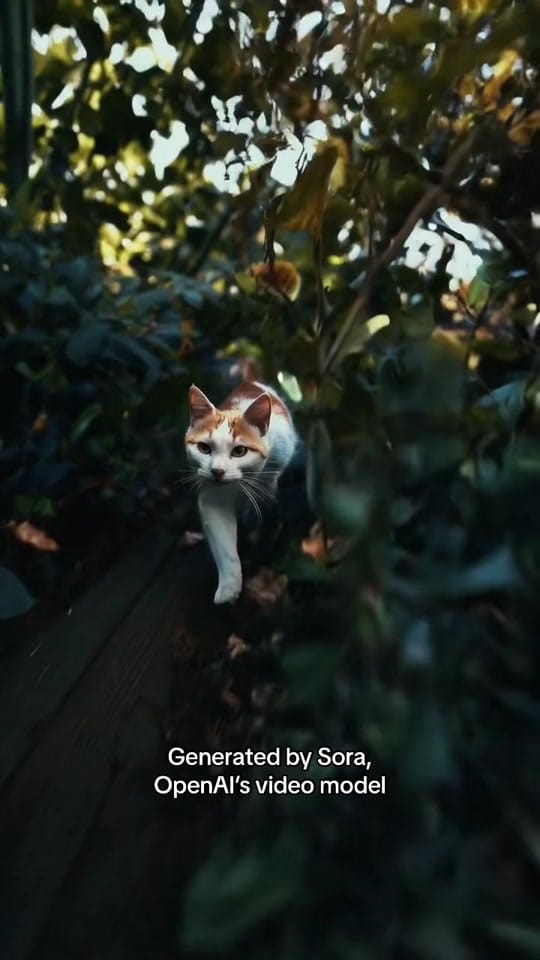 Prompt: a white and orange tabby cat is seen happily darting through a dense garden, as if chasing something. its eyes are wide and happy as it jogs forward, scanning the branches, flowers, and leaves as it walks. the path is narrow as it makes its way between all the plants. the scene is captured from a ground-level angle, following the cat closely, giving a low and intimate perspective. the image is cinematic with warm tones and a grainy texture. the scattered daylight between the leaves and plants above creates a warm contrast, accentuating the cat's orange fur. the shot is clear and sharp, with a shallow depth of field.