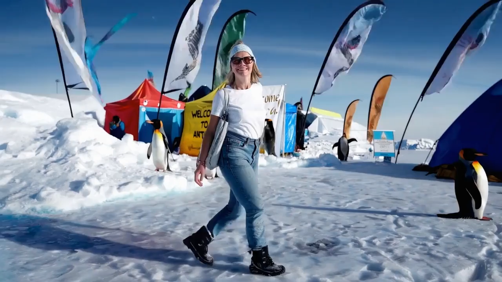 Prompt: "A woman wearing blue jeans and a white t-shirt taking a pleasant stroll in Antarctica during a colorful festival".