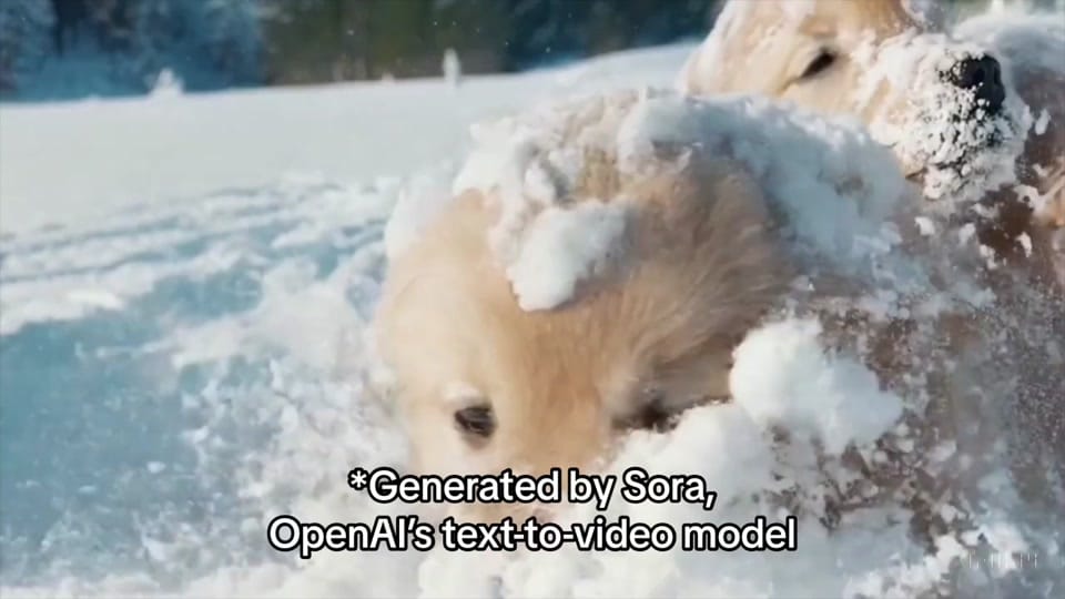 This video was generated by our text-to-video model, Sora. Prompt: “A litter of golden retriever puppies playing in the snow. Their heads pop out of the snow, covered in.”