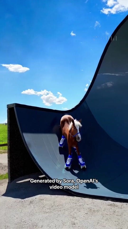 Prompt: 一匹马穿着轮滑鞋,在U型滑道中滑行。