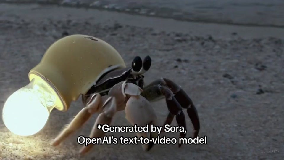 Prompt: “nighttime footage of a hermit crab using an incandescent lightbulb as its shell"