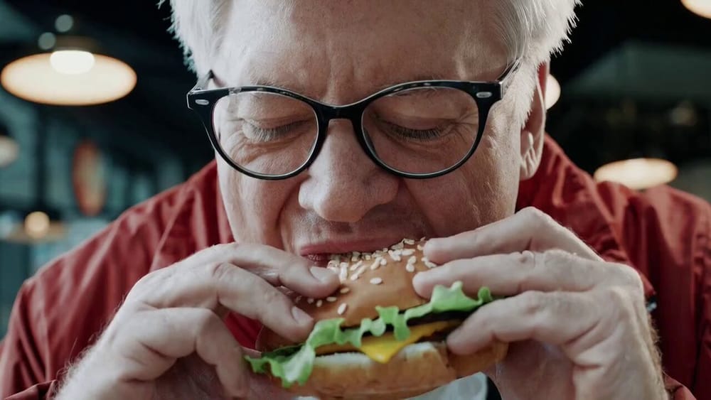 Prompt: “an older man with gray hair and glasses devours a delicious cheese burger. the bun is speckled with sesame seeds, fresh lettuce, a slice of cheese, and a golden brown beef patty. his eyes are closed in enjoyment as he takes a bite. he wears a red jacket and appears to be sitting inside a fast food restaurant.”