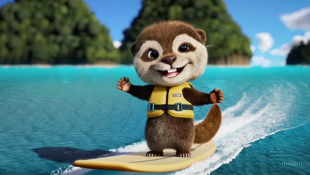 Prompt: 一只可爱的快乐水獭自信地站在冲浪板上,穿着黄色救生衣,沿着郁郁葱葱的热带岛屿附近的绿松石热带水域骑行,3D数字渲染艺术风格。