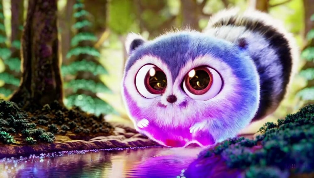 Prompt: 一个小小的、圆形的、毛茸茸的生物,有着大而富有表现力的眼睛,探索着一个充满活力、迷人的森林。这种生物是兔子和松鼠的异想天开的混合体,有柔软的蓝色皮毛和浓密的条纹尾巴。它沿着波光粼粼的溪流跳跃,惊奇地睁大了眼睛。森林里充满了神奇的元素:会发光和变色的花朵,叶子呈紫色和银色的树木,以及类似萤火虫的小漂浮灯。这个生物停下来与一群围绕着蘑菇圈跳舞的精灵般的小生物嬉戏互动。这个生物敬畏地抬头看着一棵发光的大树,这棵树似乎是森林的中心。