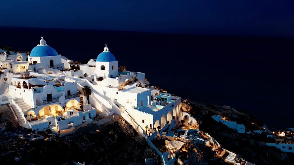 Prompt: Aerial view of Santorini during the blue hour, showcasing the stunning architecture of white Cycladic buildings with blue domes. The caldera views are breathtaking, and the lighting creates a beautiful, serene atmosphere.