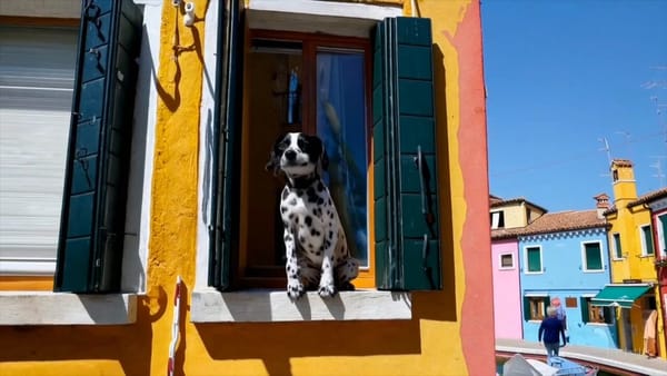 Prompt: The camera directly faces colorful buildings in burano italy. An adorable dalmation looks through a window on a building on the ground floor. Many people are walking and cycling along the canal streets in front of the buildings.