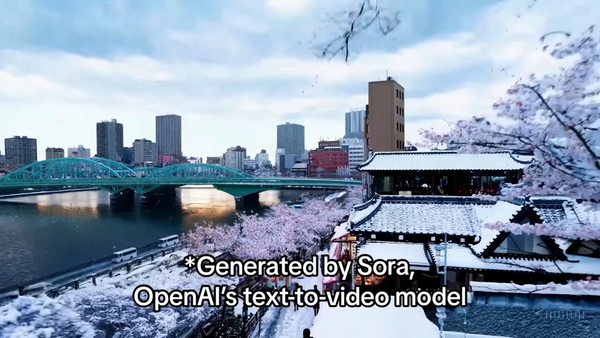 “Beautiful, snowy Tokyo city is bustling. The camera moves through the bustling city street, following several people enjoying the beautiful snowy weather and shopping at nearby stalls. Gorgeous sakura petals are flying through the wind along with snowflakes”