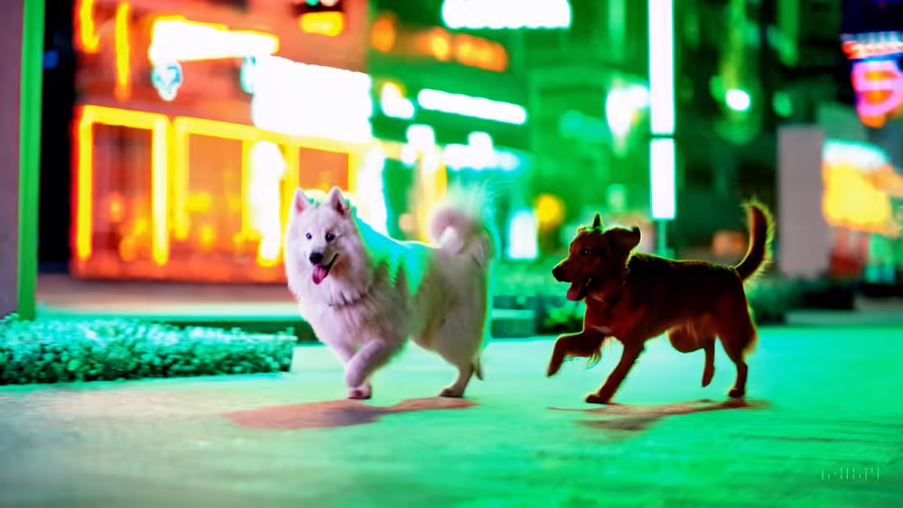 Prompt: 一只萨摩耶犬和一只金毛猎犬在夜晚的未来主义霓虹灯城市中嬉戏。附近建筑物发出的霓虹灯在它们的皮毛上闪闪发光。